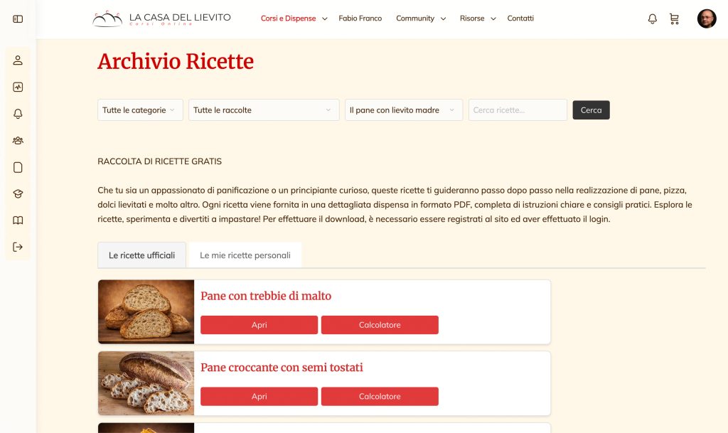 Chi ha acquistato una dispensa, infatti, non ottiene soltanto un file digitale da consultare o stampare. Ottiene anche l’accesso alla ricetta all’interno del sistema del sito, con la possibilità di ricalcolare automaticamente tutti gli ingredienti in base alla quantità di impasto desiderata.